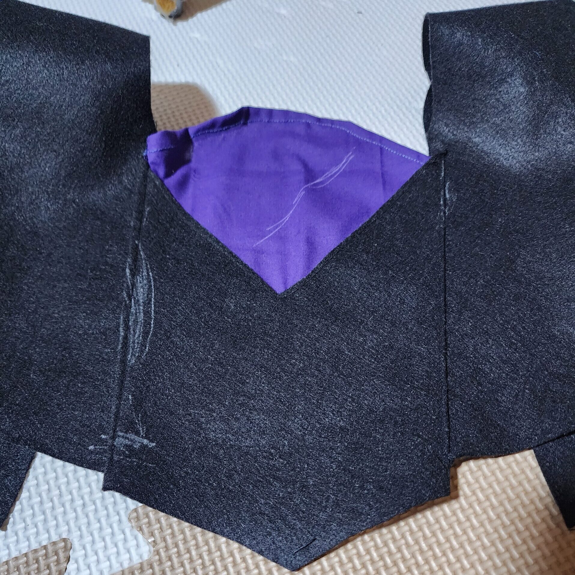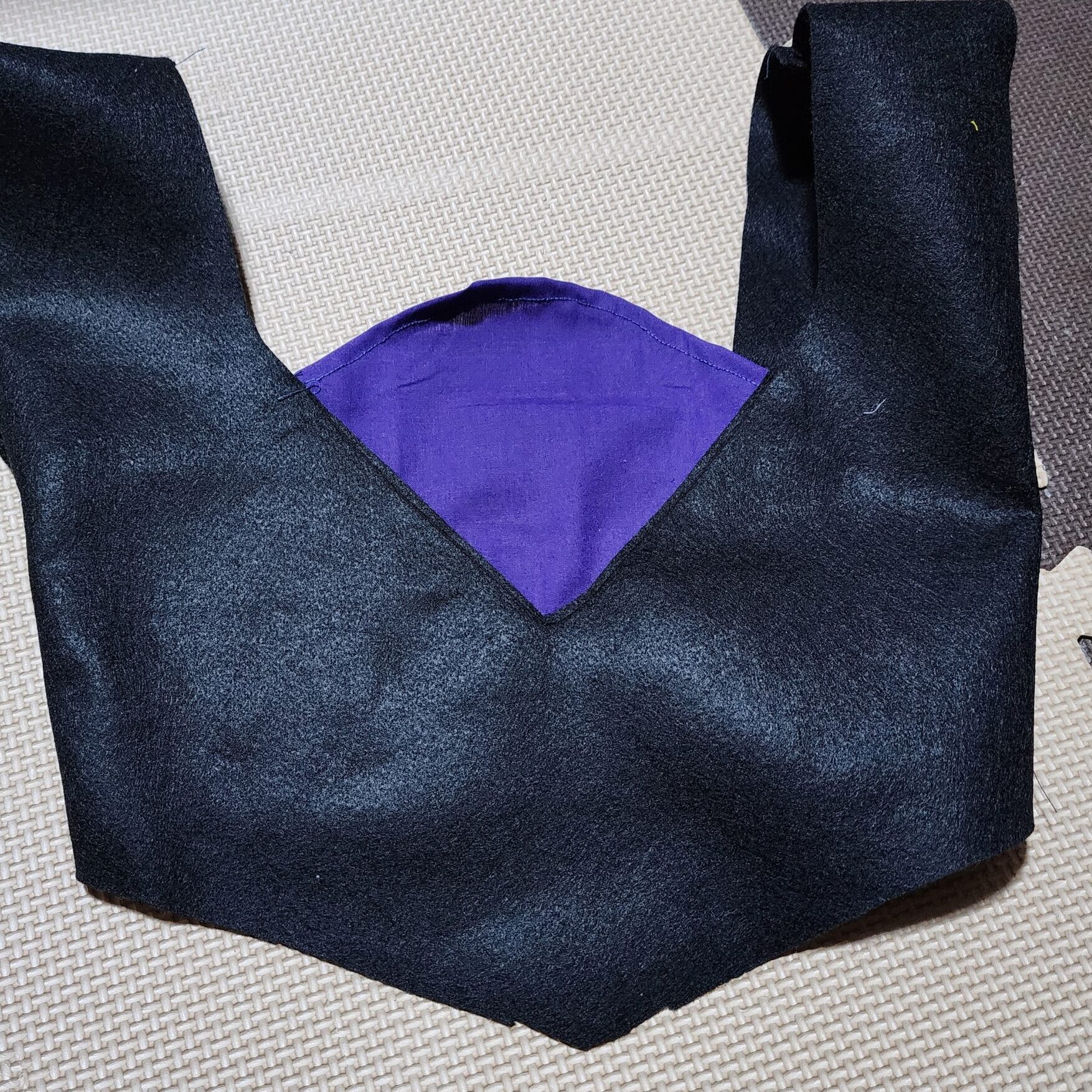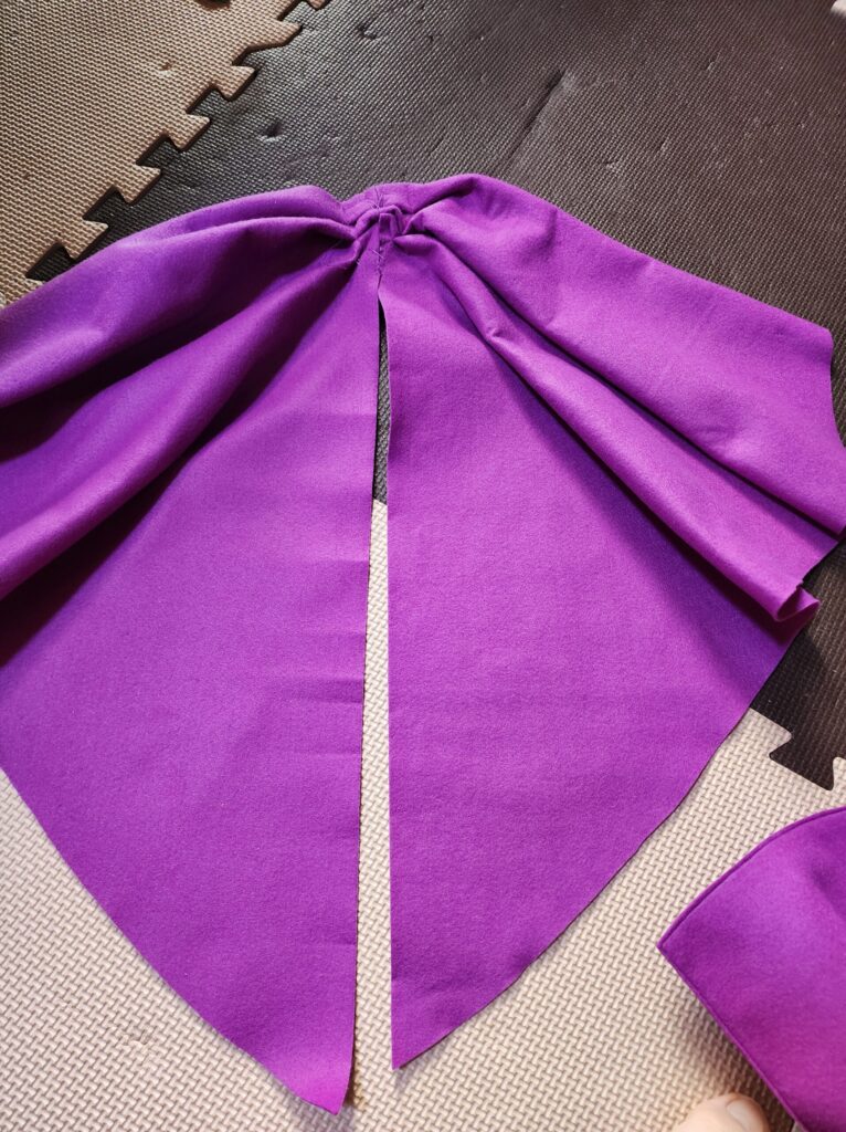 Vネックのような形で、丸い胸元のパーツで作成。色はグレーの布がなく、紫の生地で代用。