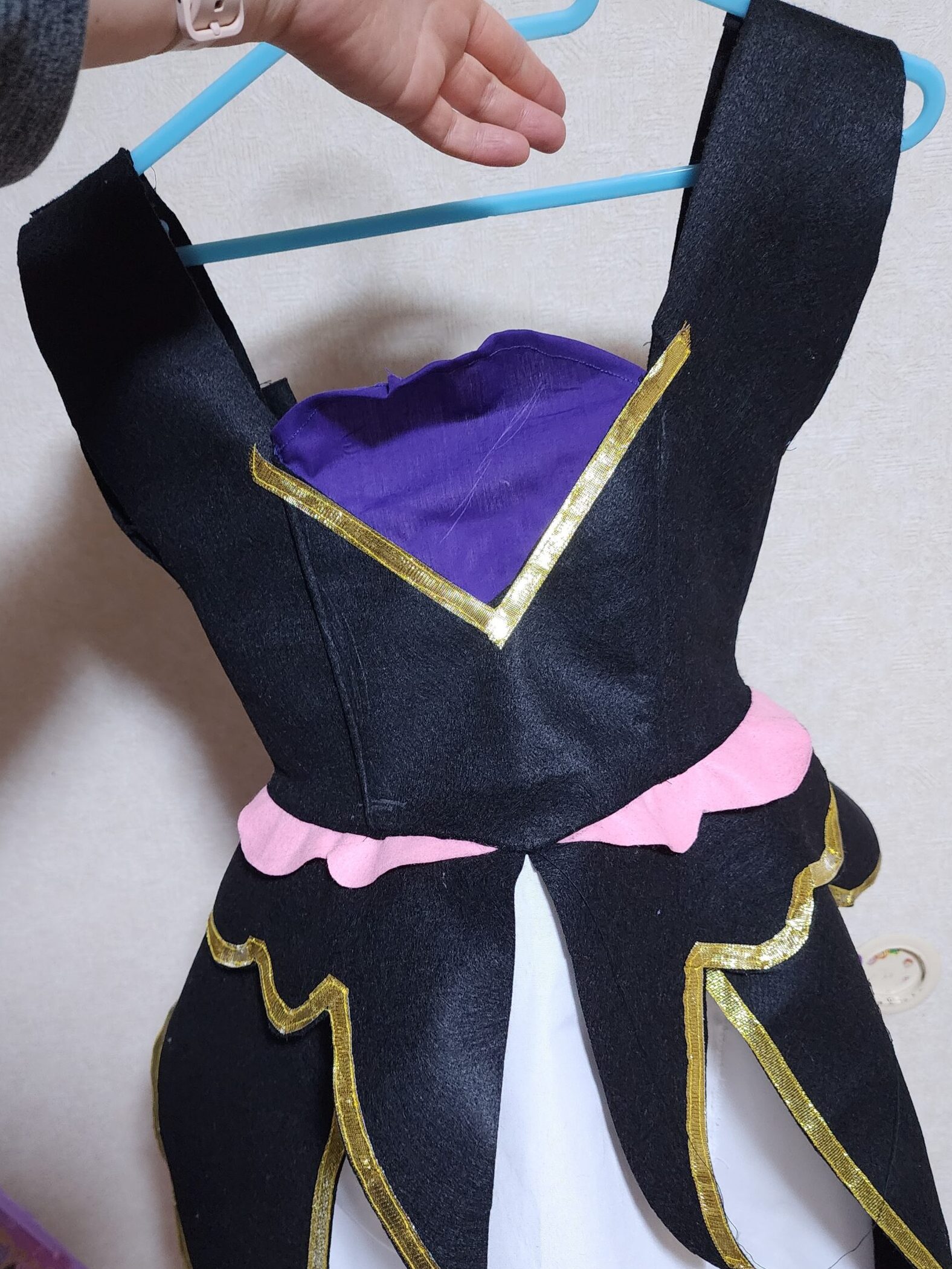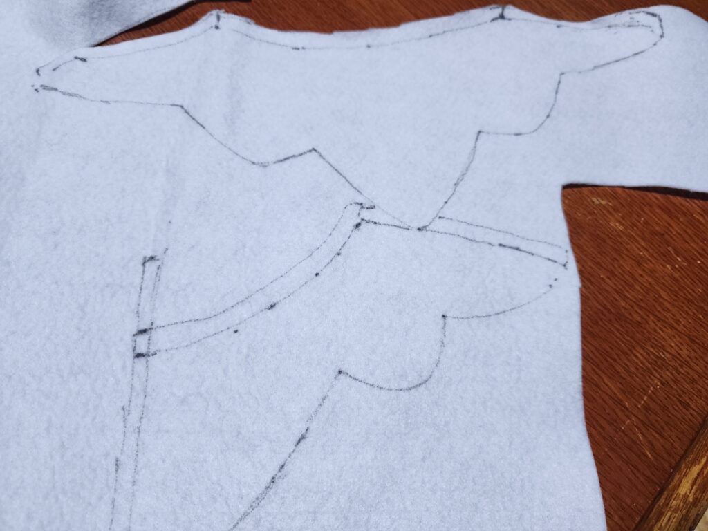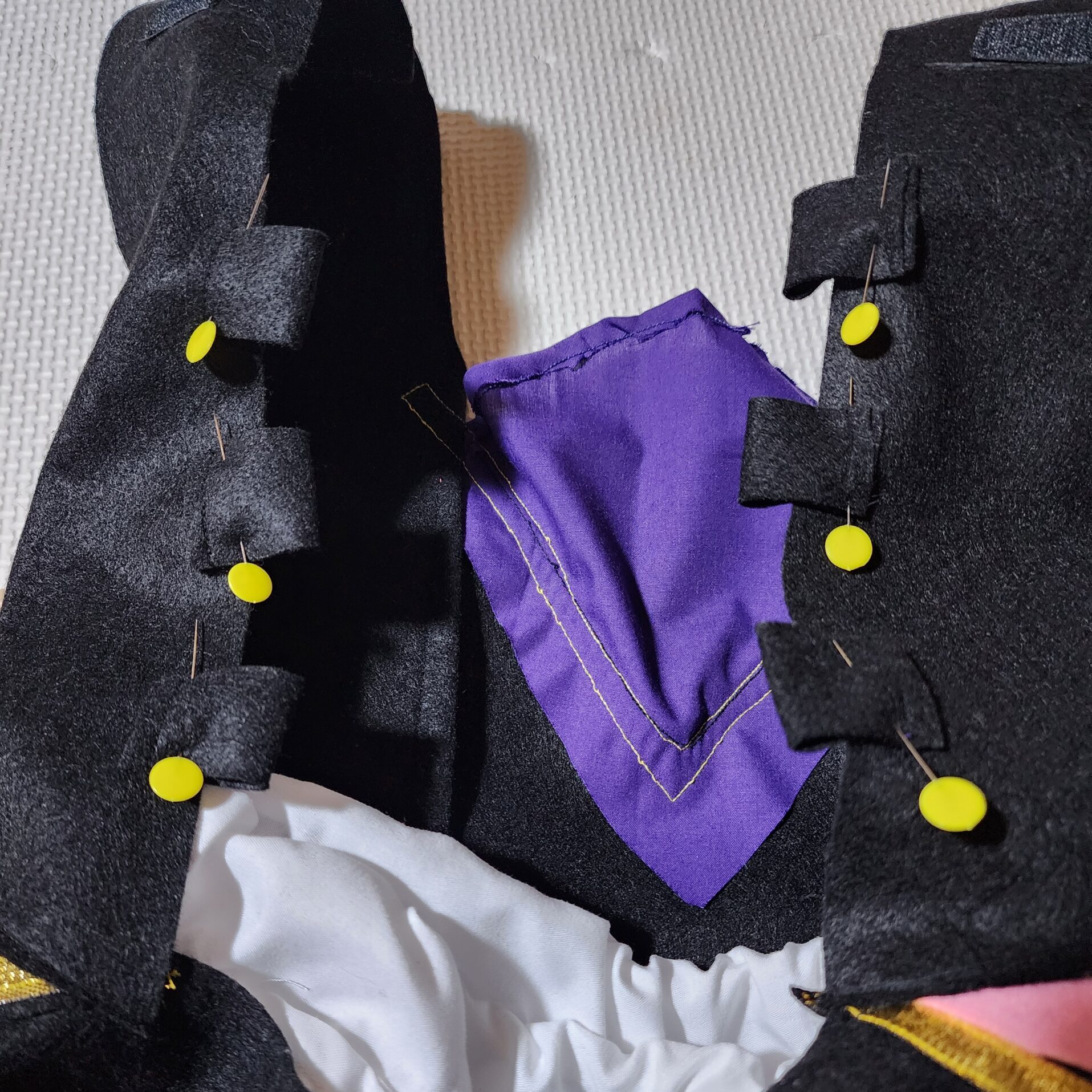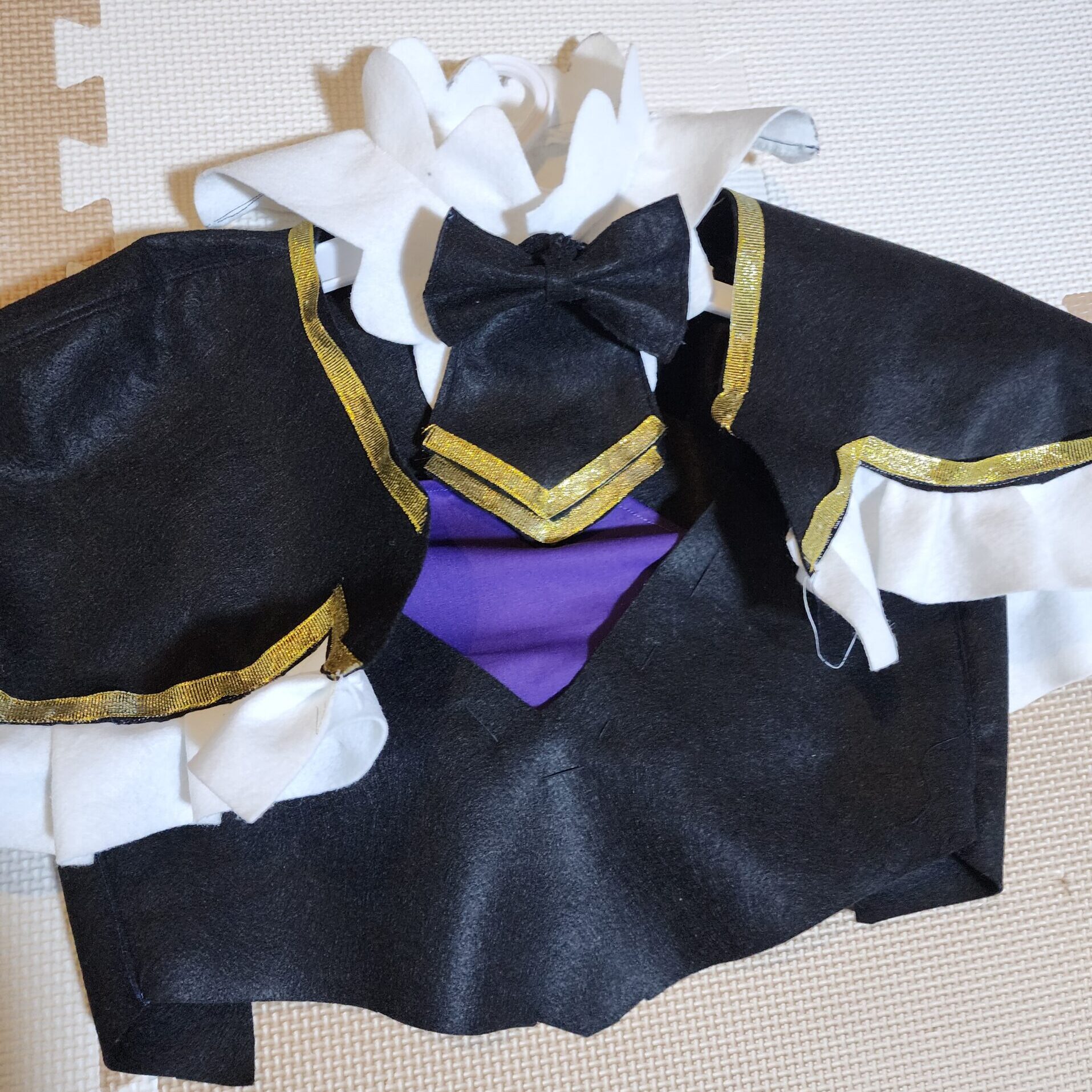 Vネックのような形で、丸い胸元のパーツで作成。色はグレーの布がなく、紫の生地で代用。
